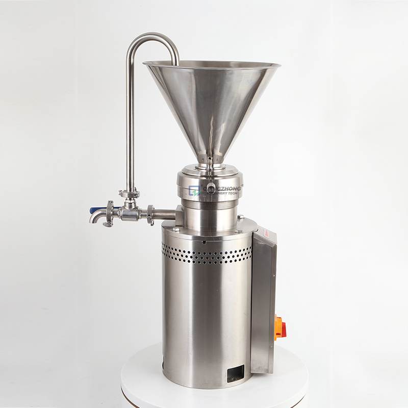 胶体磨的基本原理是流体或半流体物料通过高速相对连动的定齿与动齿之间,使物料受到强大的剪切力,磨擦力及高频振动等作用。磨碎依靠磨盘齿形斜面的相对运动而成,其中一个高速旋转,另一个静止使物料通过齿斜面之间的物料受到极大的剪切力和摩擦力,同时又在高频震动和高速漩涡等复杂力的作用下使有效地被粉碎、乳化、均质、温合,从而获得满意的精细加工的产品。
